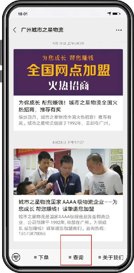 最近公眾號后臺收到不少客戶查詢貨物的運單圖片、語音、單號等查詢問題,在此聲明一下,通過公眾號發(fā)布消息,后臺不會自動為您查詢的。下面為大家介紹一下,如何通過城市之星物流微信公眾號查詢貨物、網(wǎng)點信息等。